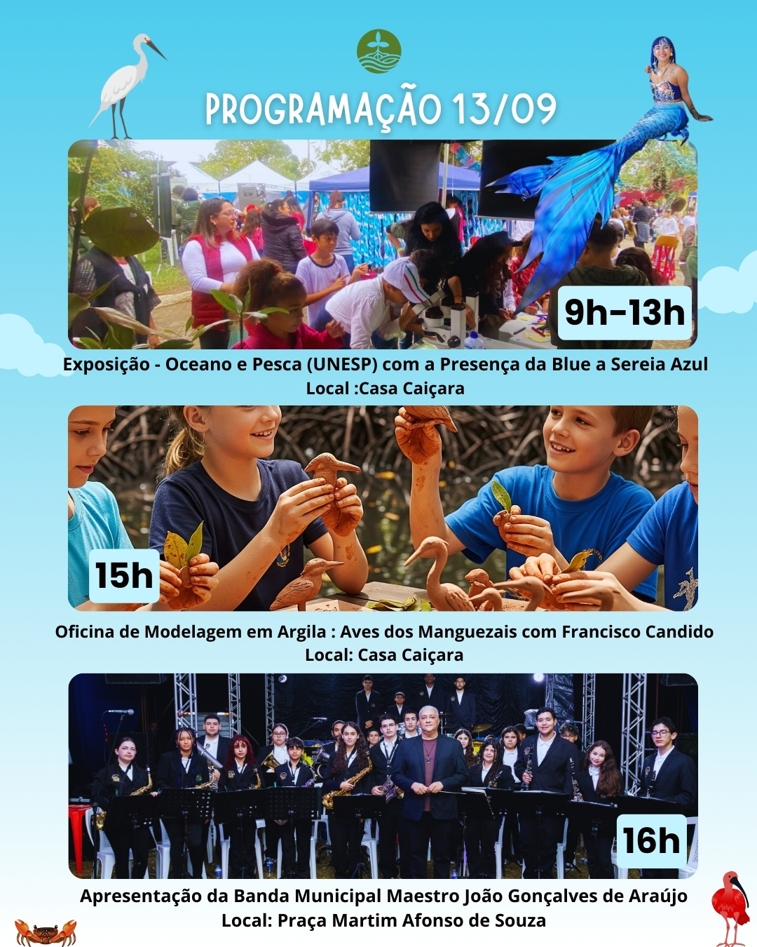 Exposição, oficina de modelagem em argila e apresentação da Banda Municipal em Cananéia.